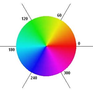 درجة اللون هي نفسها درجة الزاوية التي تؤدي إليه من 0° إلى 360°